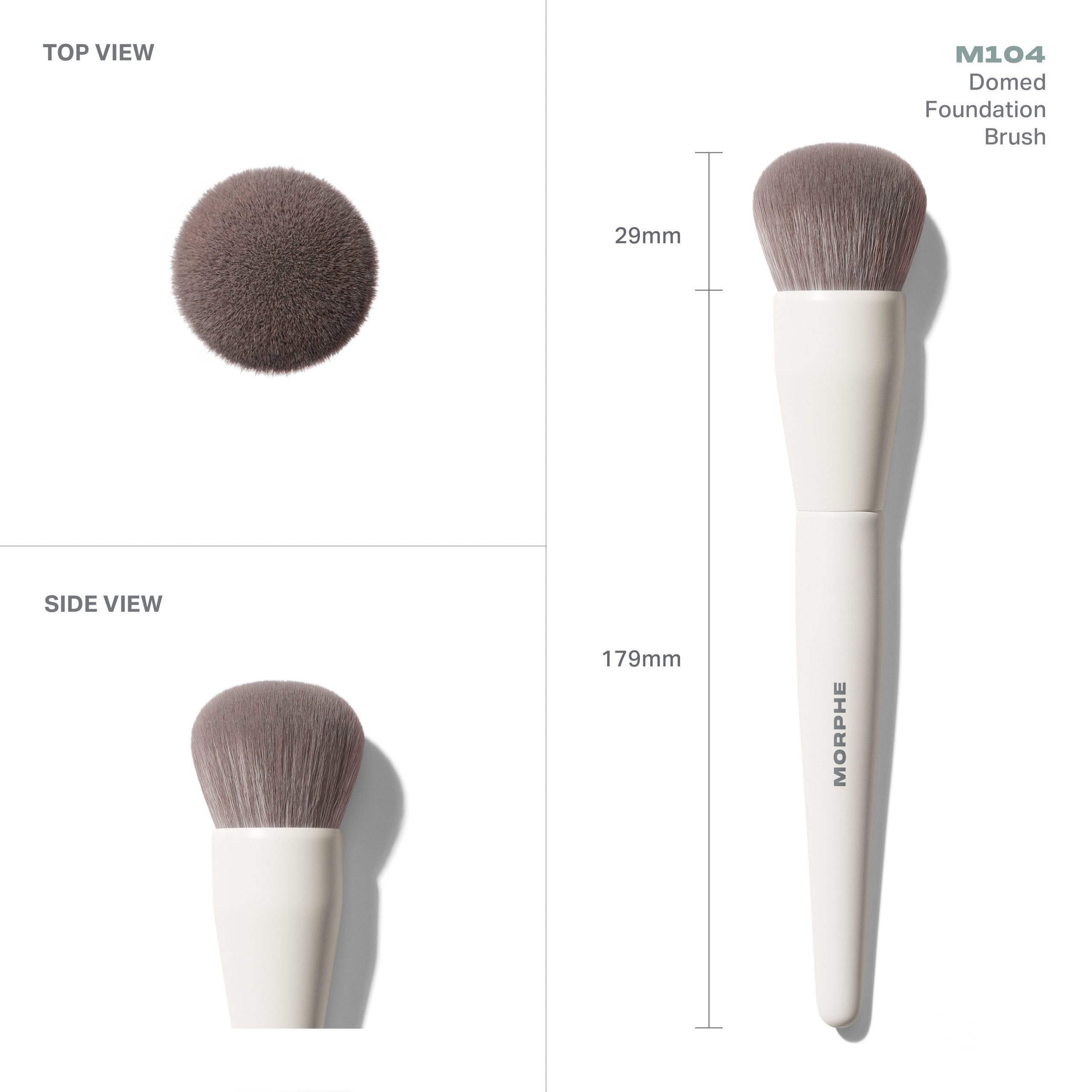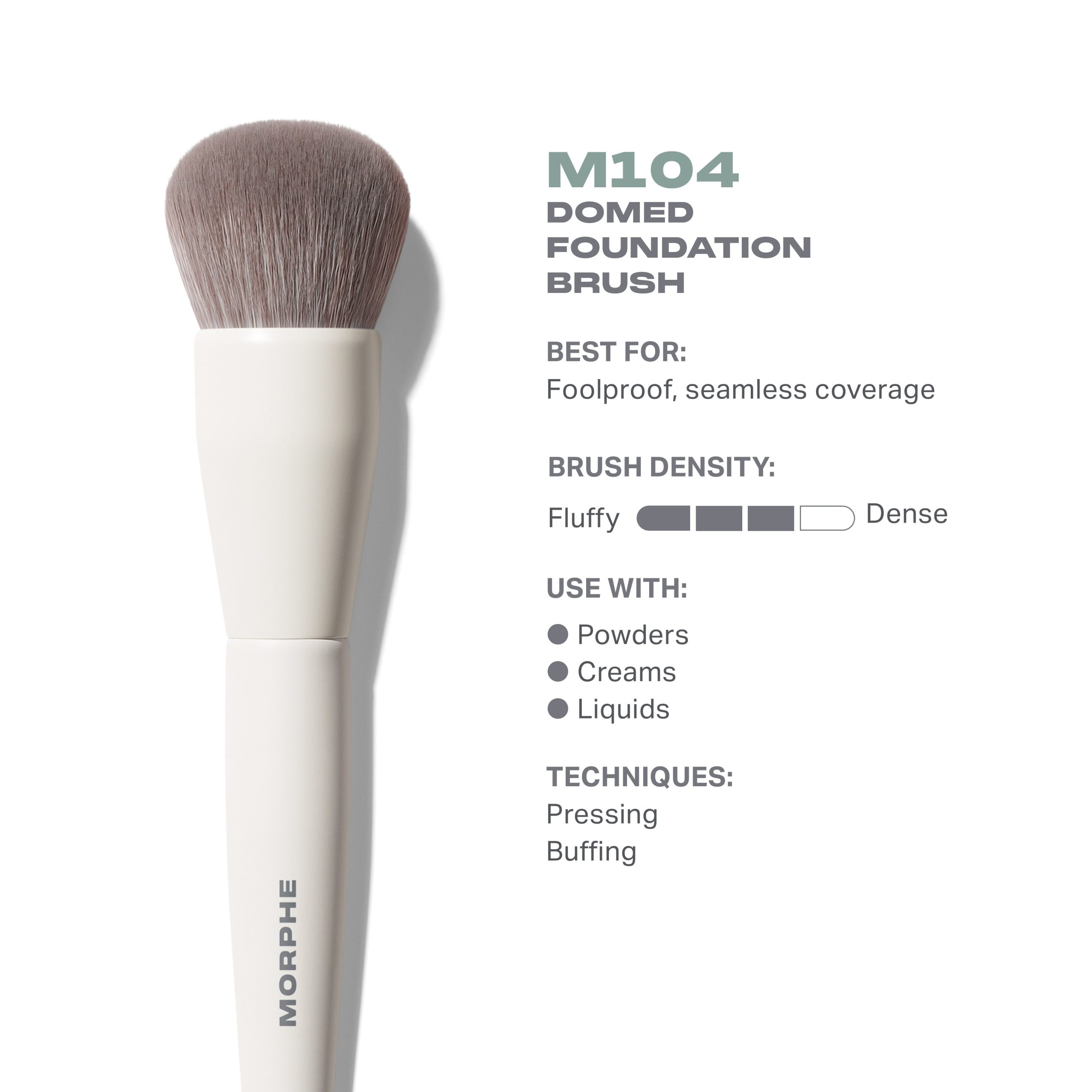 The plush surface of the M104 Domed Foundation Brush fans out on contact. making it a one-and-done favorite essential for an effortless dispersion of product. Use the rounded edges for uniform application around your eyes and nose.