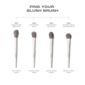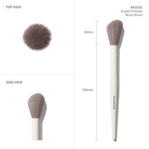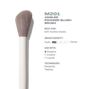 The fluffy. flexible angled tip of the M201 Angled Powder Blush Brush helps perfects a pinch of cheek color. Use it as well to gently tap powder blush over cream or liquid blush. It will set the application. without disturbing the product underneath.