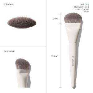 The M243 Slanted Cream & Liquid Contour Brush combines the power of a paddle and the precision of a slant in one. The benefit? A firm. flat tip for stamping on product to map out your contour before blending it out. Use it on your cheek hollows. jawline. or anywhere you want targeted color laydown.