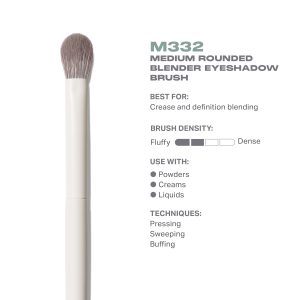 The workhorse of eyeshadow brushes. the formula-flexing M332 Medium Rounded Blender Eyeshadow Brush is incredibly versatile. Use it on its side to sweep on a soft wash of color. use it on its tip to pack color in creases. and then use back-and-forth motions to blend out application.