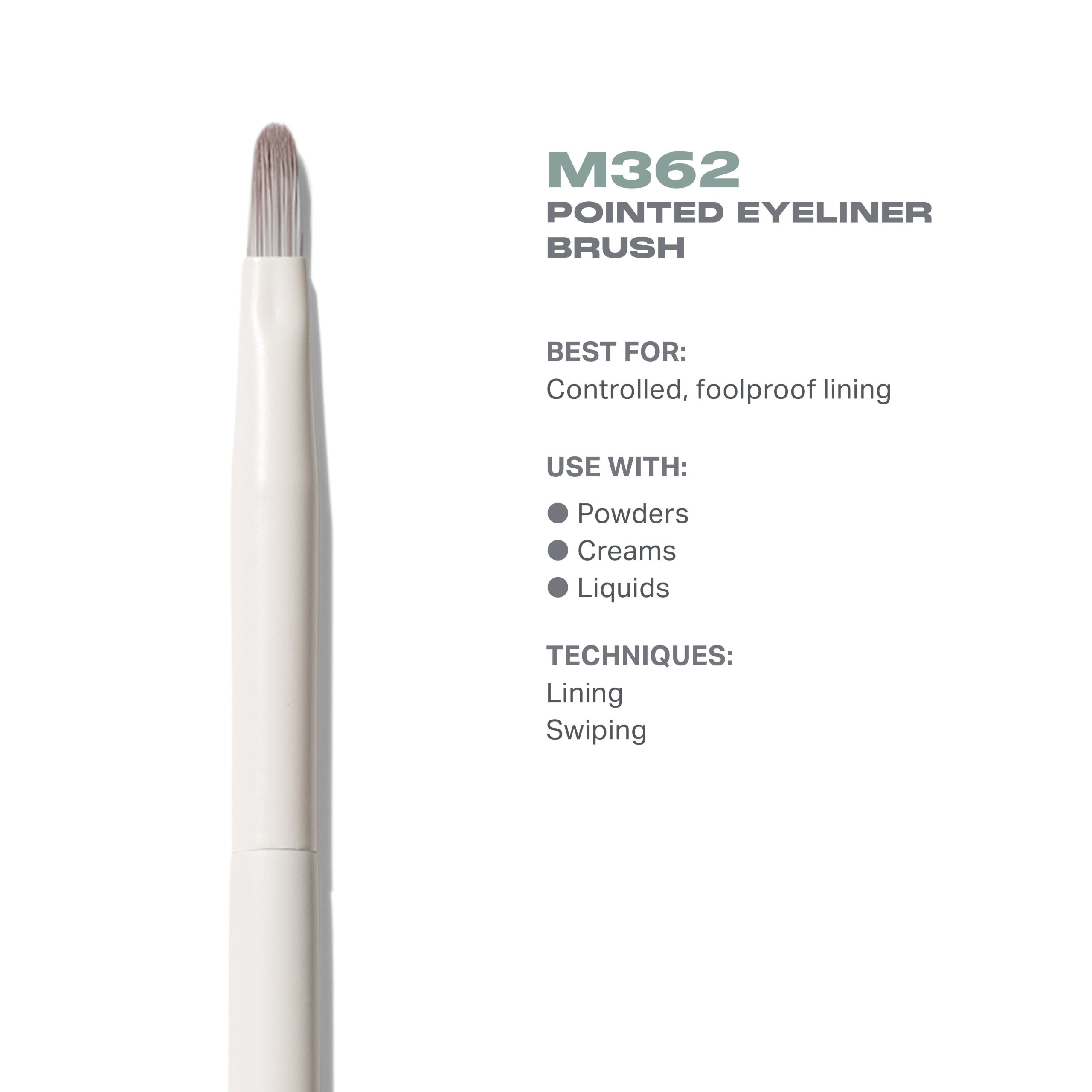 The densely bristled. fine point of the M362 Pointed Eyeliner Brush helps you get into the details. It provides controlled application along your lashes. whether you’re lining. perfecting a cat-eye. or creating a graphic look. Start with small dashes to map out placement. then go in with longer strokes for seamless results.